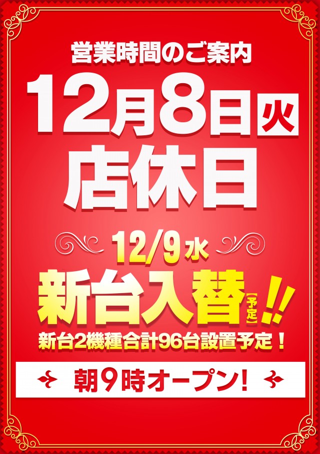12月8日(火) 店休日 12月9日(水)新台入替(予定)