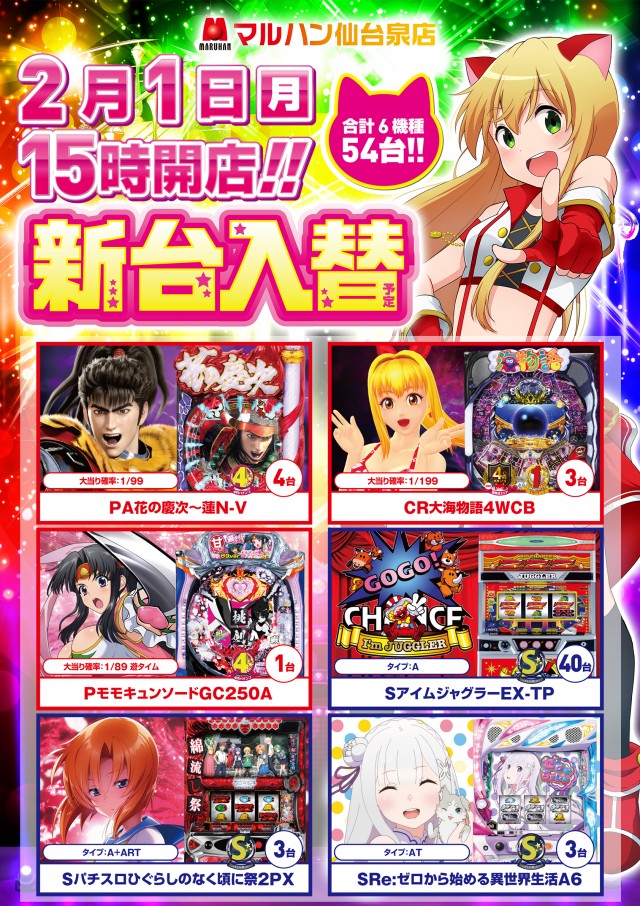 🌈2月1日(月) 新台入替(予定) 15時オープン!🌈