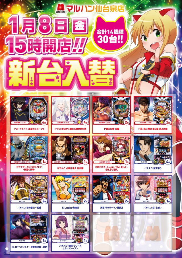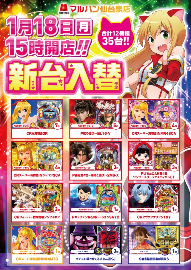 🌈1月18日(月) 新台入替(予定) 15時オープン!!🌈