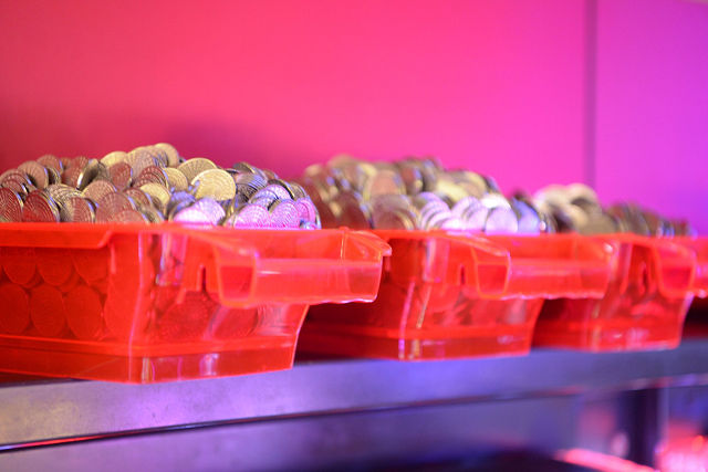 4円パチンコエリアには、真っ赤な玉箱絨毯が敷かれている!