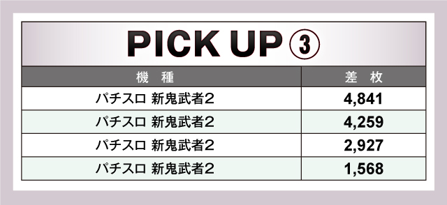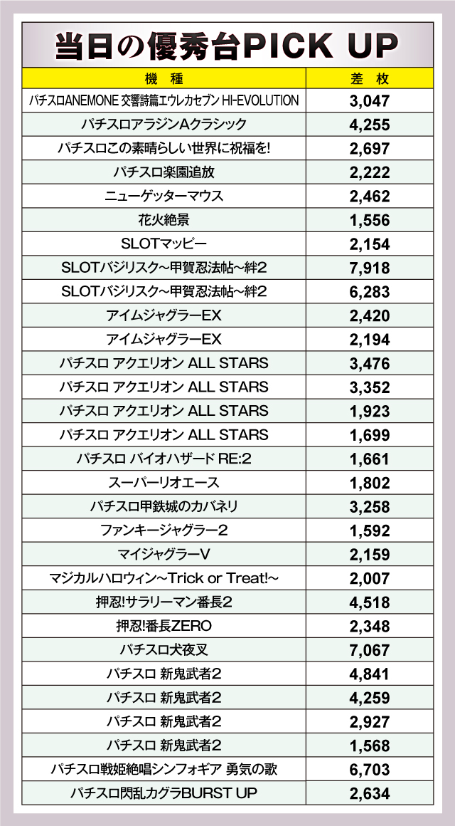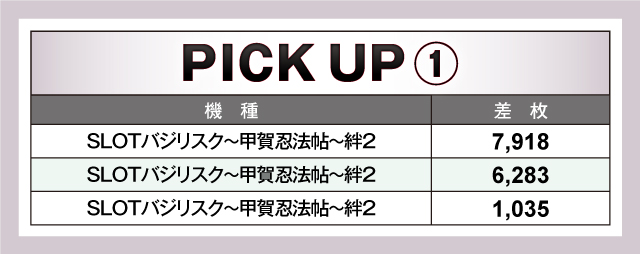 PICK UP機種には『SLOTバジリスク~甲賀忍法帖~絆2』、『パチスロ アクエリオン ALL STARS』、『パチスロ 新鬼武者2』を選定。どれも素晴らしい波を描き、遊技していたファンを虜にしていたぞ!