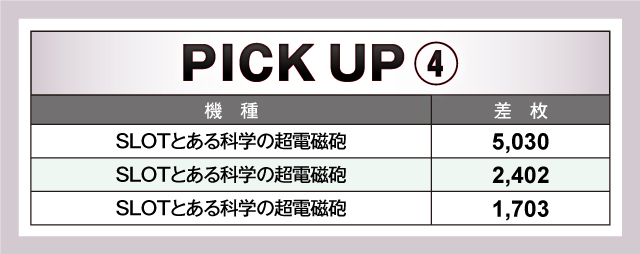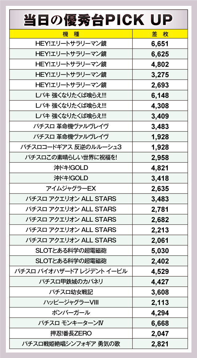 優秀台を見てみると、トップに立ったのは+6,668枚を記録した『パチスロ モンキーターンⅣ』。スマスロの話題が多い中、まだまだ負けていられないことをアピールした。そうはいっても、やはりスマスロは強い。それに続いたのが+6,651枚、+6.635枚をマークした『HEY!エリートサラリーマン鏡』。ホールデビュー以来、驚異の出玉力で人気になっているスマスロだが、その勢いは年が明けても止まらないようだ。これに続いたのもスマスロ『Lバキ 強くなりたくば喰らえ!!!』で、差枚は+6.148枚を記録した。以下、+5,030枚の『SLOTとある科学の超電磁砲』、+4,821枚の『沖ドキ!GOLD』、+4.529枚の『パチスロ バイオハザード7レジデント イービル』、+4,427枚の『パチスロ甲鉄城のカバネリ』と続いた。