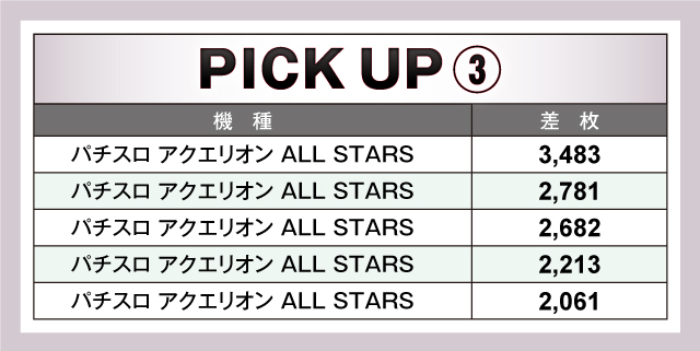 ピックアップ機種は、前出の『HEY!エリートサラリーマン鏡』、『Lバキ 強くなりたくば喰らえ!!!』、『SLOTとある科学の超電磁砲』に加え、『パチスロ アクエリオン ALL STARS』が盛り上がりを見せていた。