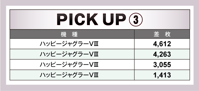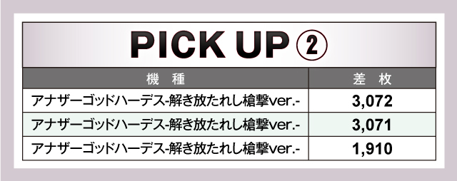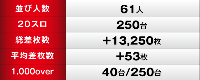 終わって見れば、優秀台、ピックアップ機種ともに活躍し、トータルの差枚は+13,250枚を記録。見事な連勝を果たした。1,000over台も40台/250台をマークし、またしても英雄が何人も生まれたのであった。