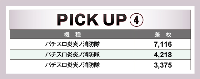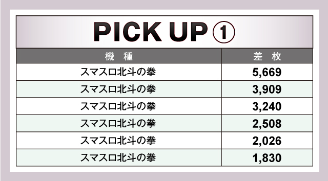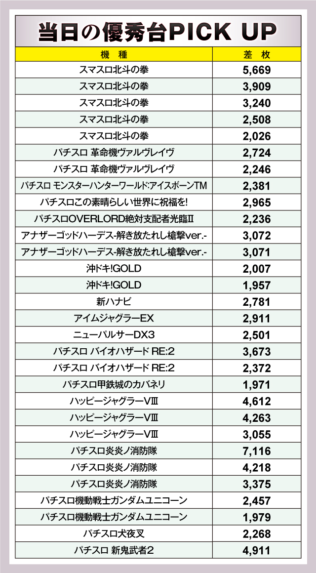 優秀台を見てみると、トップに立ったのは+7,116枚を記録した新鋭の『パチスロ炎炎ノ消防隊』。同機種は他にも+4,000枚オーバー、+3,000枚オーバーの台を送り出しており、インパクト抜群のデビューを果たした。これに続いたのが、こちらもデビューするや否や、いきなり人気機種の仲間入りを果たした『スマスロ北斗の拳』。+5,669枚を筆頭に、+3,909枚、+3,240枚と優秀台がズラリ。さすがの実力を見せた。定番機種も負けてはいない。『パチスロ 新鬼武者2』が+4,911枚をマークし、人気に応えていた。以下、+4,612枚の『ハッピージャグラーⅧ』、+3,673枚の『パチスロ バイオハザード RE:2』、+3,072枚の『アナザーゴッドハーデス-解き放たれし槍劇ver.-』等が続いた。