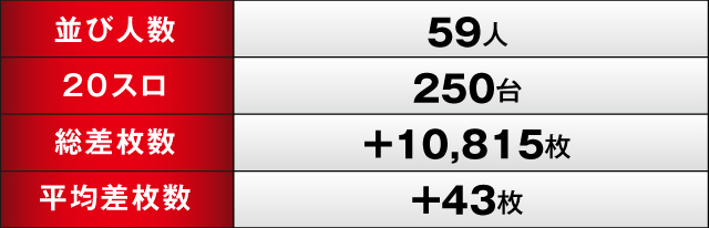 優秀台、ピックアップ機種だけでなく、さまざまな機種が活躍して、終わって見ればトータルの差枚は+10,815枚を記録。堅実な勝利で、連勝をさらに伸ばすことに成功した。次回が楽しみな一戦となったのであった。