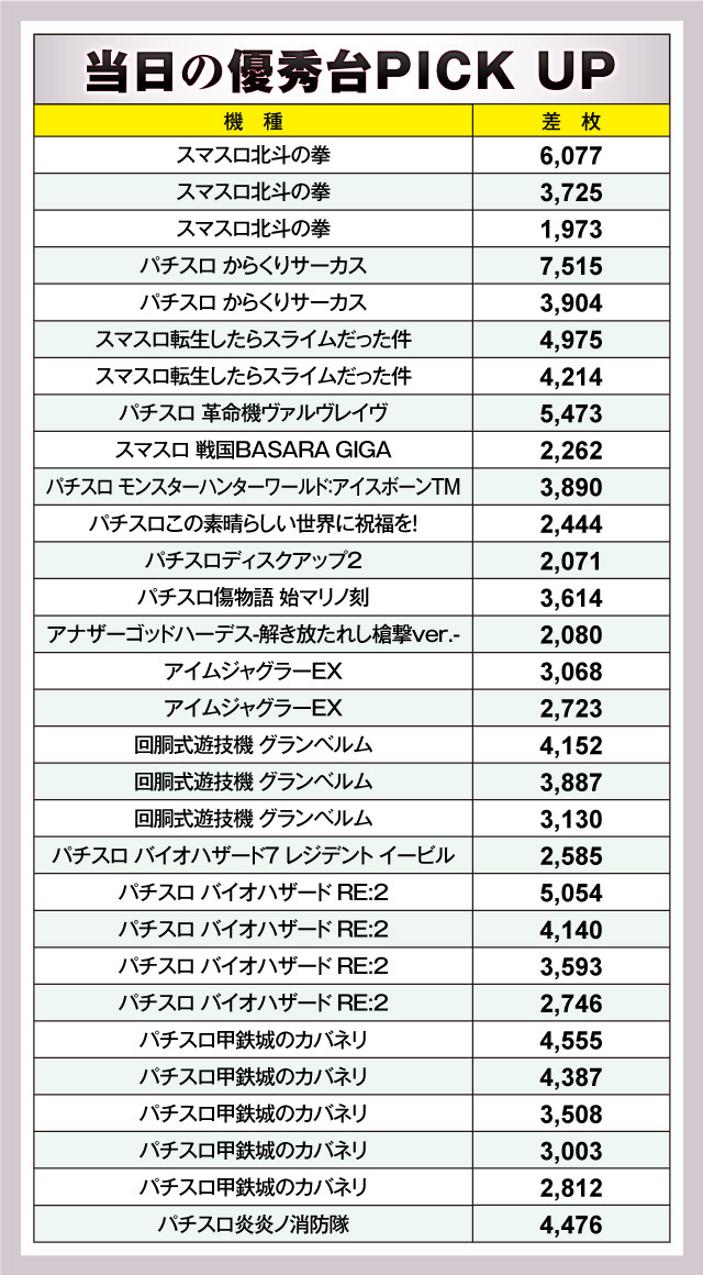 優秀台を見てみると、+7,515枚を記録した『パチスロ からくりサーカス』がまず目に入る。今回もあらためてその実力を示してくれた。それに続いたのが+6,077枚の『スマスロ北斗の拳』。スマスロの代表格としての座は揺るぎない。+5,473枚の『パチスロ 革命機ヴァルヴレイヴ』も優秀。スマスロの先駆者としての功績は大きいが、まだまだ現役バリバリだ。『パチスロ バイオハザード RE:2』も負けてはいない。+5,054枚を筆頭に+4,140枚、+3,593枚と優秀台がズラリ。以下、+4,975枚の『スマスロ転生したらスライムだった件』、+4,555枚、+4,387枚の『パチスロ甲鉄城のカバネリ』、+4,476枚の『パチスロ炎炎ノ消防隊』、+4,152枚の『回胴式遊技機 グランベルム』と続いた。