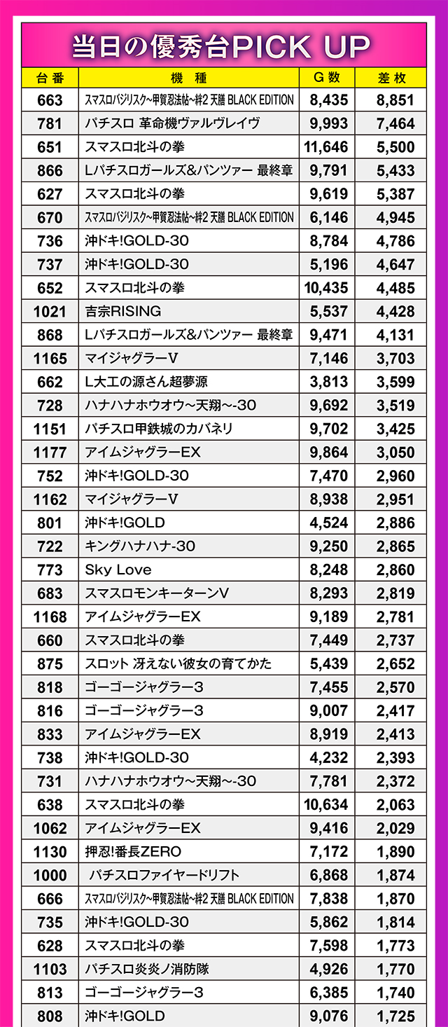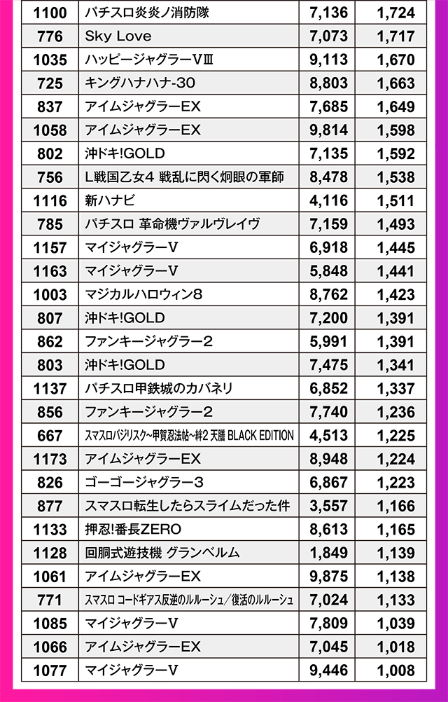 前回よりも遥かに好結果が多かったこの日。ざっとカウントしただけでも前回の3倍以上もの好レコードを目撃することとなった。今回の首位記録は『スマスロバジリスク~甲賀忍法帖~絆2 天膳 BLACK EDITION』。次いで『パチスロ 革命機ヴァルヴレイヴ』『スマスロ北斗の拳』『Lパチスロガールズ&パンツァー 最終章』などの人気マシンたちがしっかり実力を示してくれた。