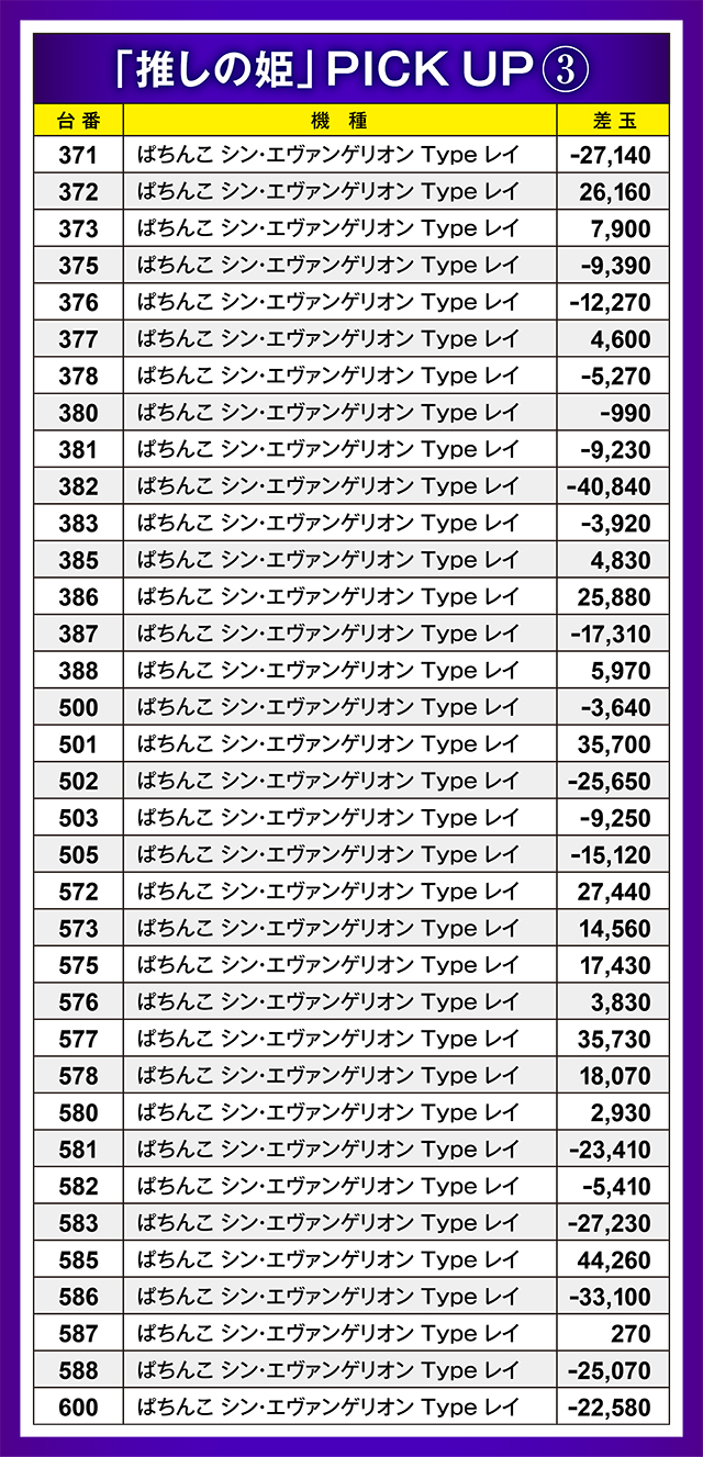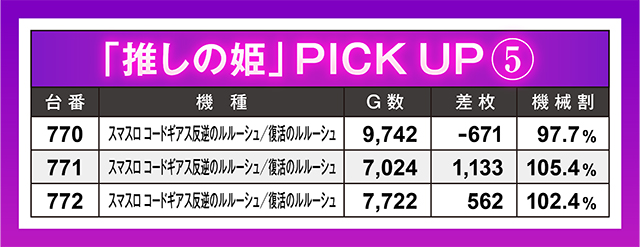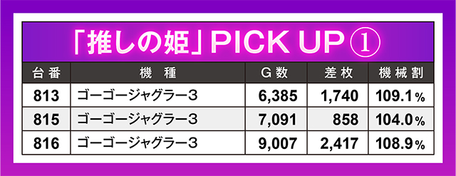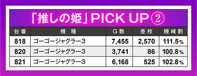 1台挟んでまたもや3台並びっぽい挙動を確認。こちらは2,500枚を突破した818番台以外は控えめな結果だったものの、決して悪い挙動ではなかった。