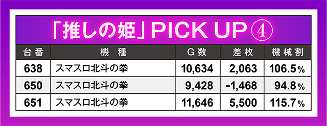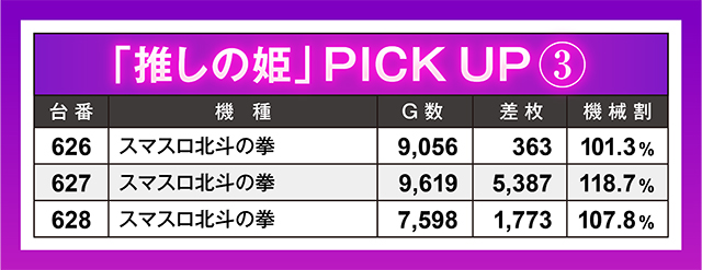 627番台が優秀台ならではの挙動で5,000枚オーバーを果たした『スマスロ北斗の拳』。その反動なのか、お隣の626番台はややふがいない結果で終わってしまった。