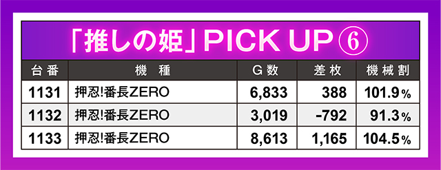 こちらの『押忍!番長ZERO』の3台はいずれも低空飛行のままフィニッシュ。差枚結果こそおとなしめだったが、その挙動は優秀台のそれと遜色ないものだった。