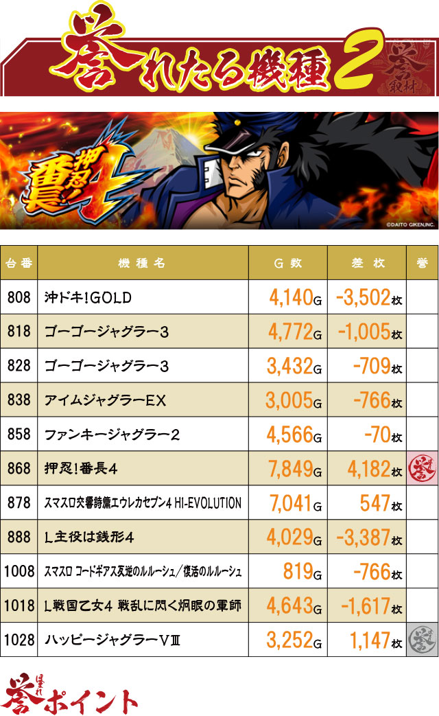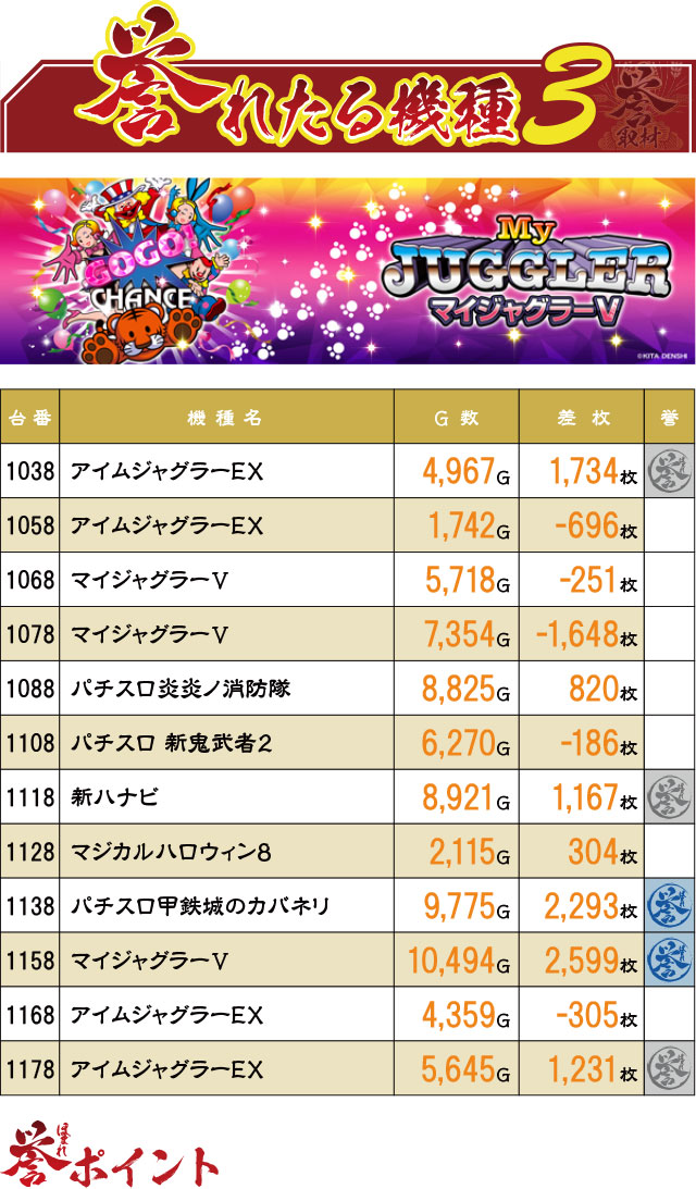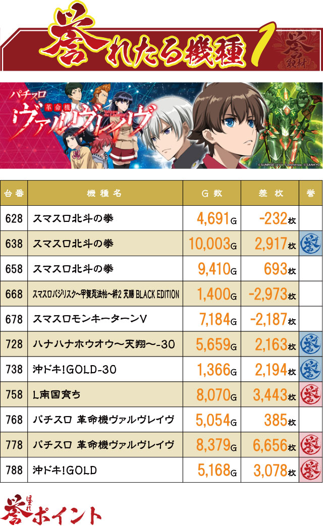 まだまだ末尾8の台に注目。こちらは誉マーキングが少なく、マイナス台もあるが、「誉れたる機種1」のあからさまな結果を見るに、こっちも怪しい…。