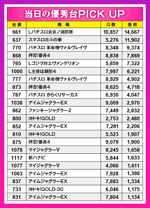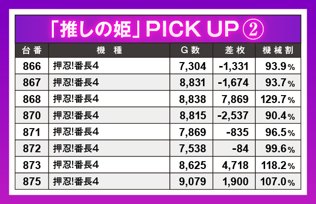 868番台から8,000枚に迫るモンスターレコードが飛び出した『押忍!番長4』。さらに873番台からは4,500枚オーバー記録が生まれた。反面、優秀台挙動を示しながらそのポテンシャルを発揮できなかった台も。