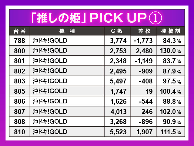 勝率こそそこまで高くならなかったものの、複数の台に優秀台挙動が見てとれた『沖ドキ!GOLD』。全台系がよく出現する取材日だけに、今回の全台系は『沖ドキ!GOLD』なのかも…!?