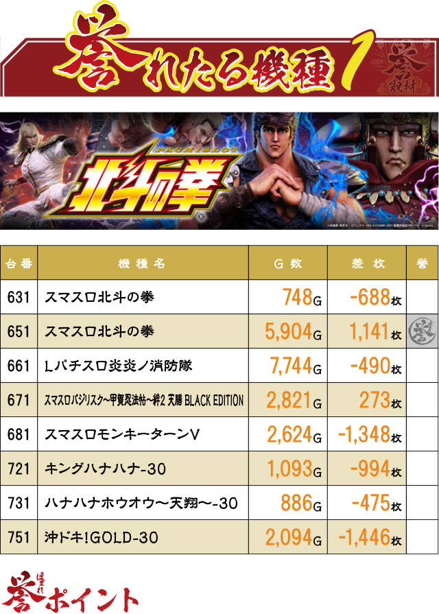 こちらのブロックでも末尾①の台に注目。総ゲーム数が3,000G未満の台にはマイナス台もあったが、6,000G以上回されていた2台にはしっかり誉マークが!これは…!