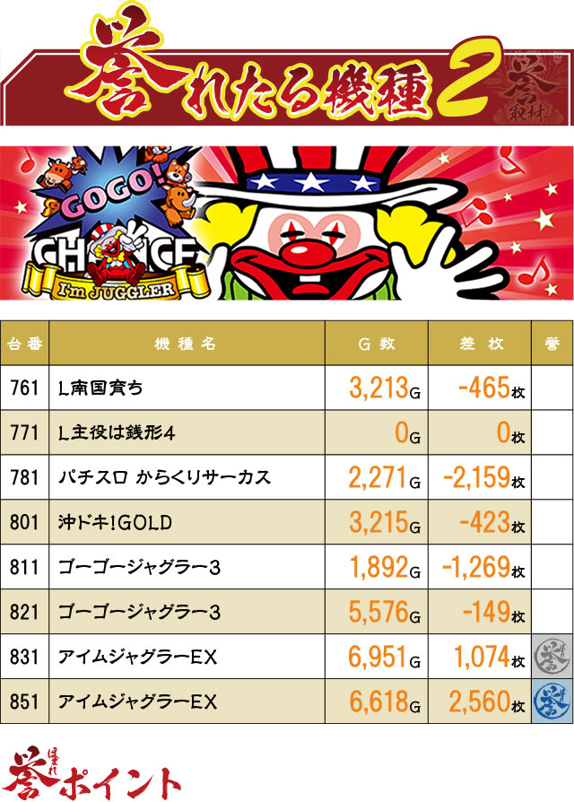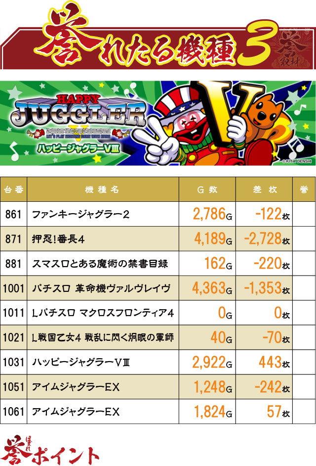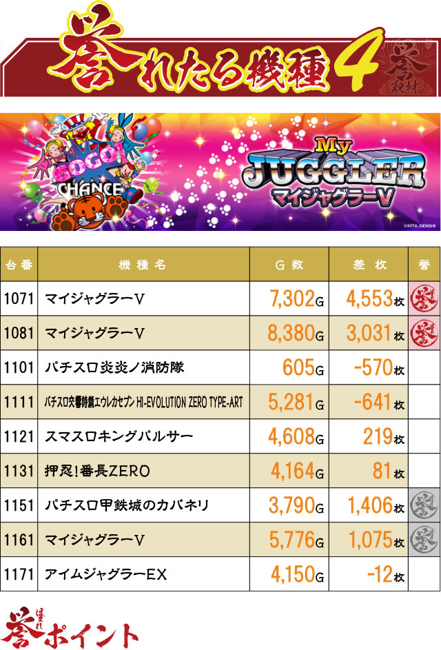 『ジャグラー』シリーズのような反応しやすい台で、なおかつきっちり回されれば誉マークがつくほどの活躍を見せたのも当然だったのかもしれない。特に1071・1081番台の『マイジャグラーⅤ』は、優秀台としか考えられない結果に。