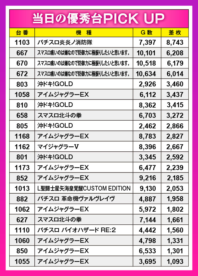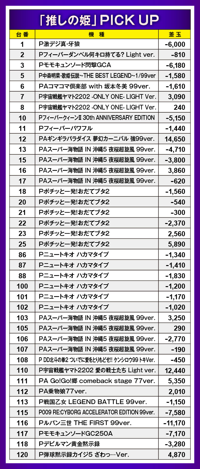 過去4回の結果では、パチスロコーナーに全台系っぽい機種が出現していた。そうなると今回の『沖ドキ!GOLD』も全台系ではなかったのか、と勘繰ってしまうのは当然のこと。推しの姫取材の日は全台系機種が出現するのがお約束となりつつある。またパチンコの方はメイン機種ではなく、バラエティーコーナーの動向に着目。記録よりも楽しさを重視するパチンカーが多かったようだ。