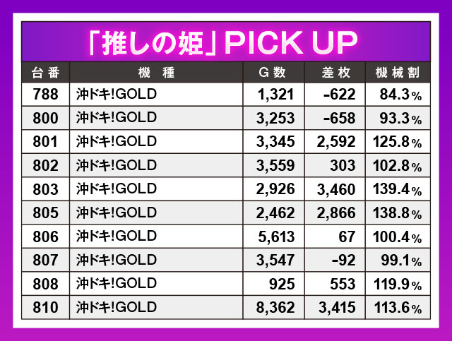10台設置の『沖ドキ!GOLD』の勝率は7割(7/10台)。マイナスの3台の差枚結果はわずかな数値であり、もっとしっかり回されていたらプラスに転じていた可能性が高い。そう考えると、全台系だった可能性も十分…!