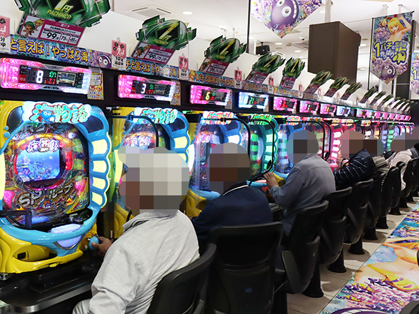 14時ごろの4円パチンコでは「新世紀エヴァンゲリオン〜未来への咆哮〜」や「P大海物語5 ブラック」で好調なプレイヤーが見受けられ、時折見せる嬉しそうな表情が印象に残っている。