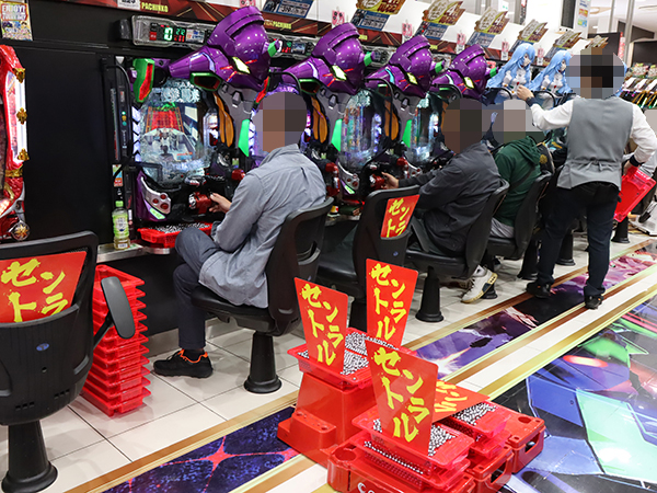 14時半ごろの4円パチンコの様子を見ると「新世紀エヴァンゲリオン〜未来への咆哮〜」や「P大海物語5 ブラック」が大盛り上がり。機種性能を存分に発揮するプレイヤーを目の当たりにしている。