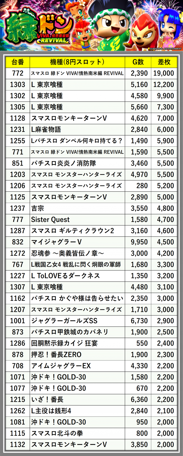 厳選された取材対象機種をはじめ、その他スロット全体から好記録が飛び出した!プレイヤーが楽しんだ1日を下記データにて振り返ってみて欲しい。