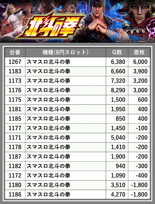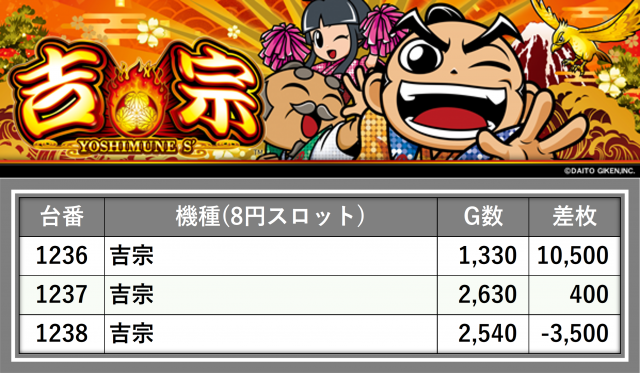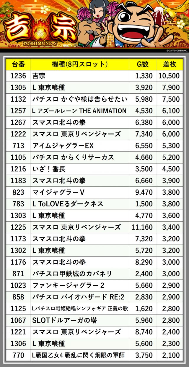 厳選された取材対象機種をはじめ、その他スロット全体から好記録が飛び出した!プレイヤーが楽しんだ1日を下記データにて振り返ってみて欲しい。