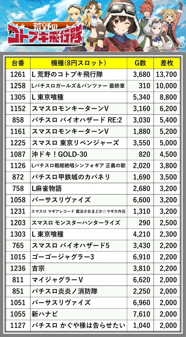 厳選された取材対象機種をはじめ、その他スロット全体から好記録が飛び出した!プレイヤーが楽しんだ1日を下記データにて振り返ってみて欲しい。