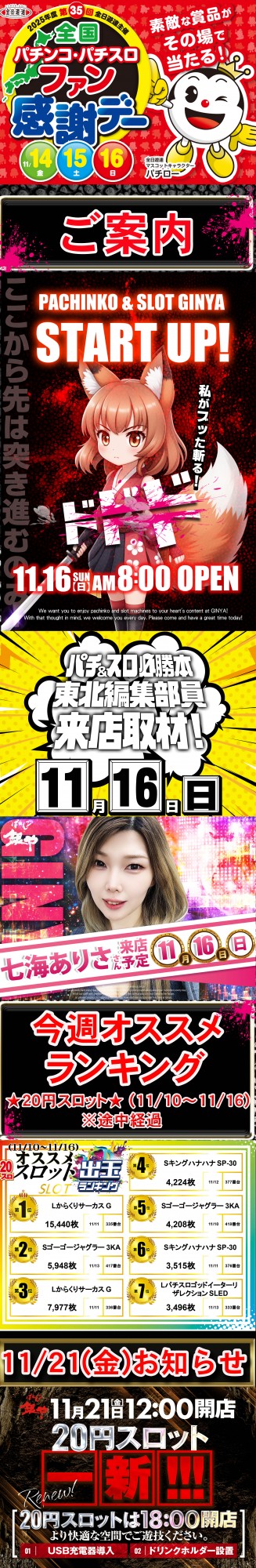 🌈ぱちんこ銀や 11/16 ご案内🌈
