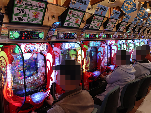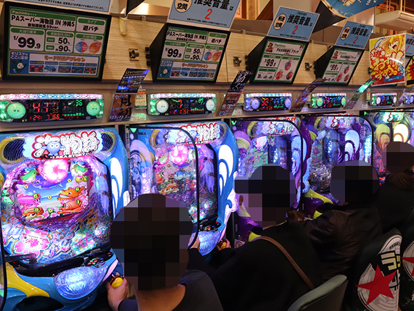 17時ごろの100円/86玉パチンコでは、「PAスーパー海物語 IN 沖縄5 夜桜超旋風 99ver.」や「PA大海物語5 Withアグネス・ラム」のシマから活気が感じられ、プレイヤーのイキイキとした表情が印象に残っている。