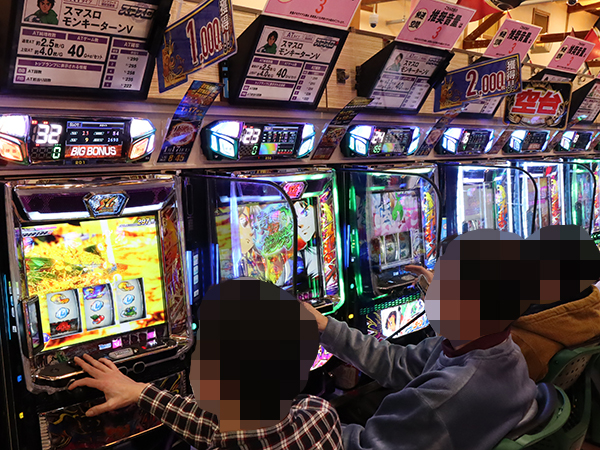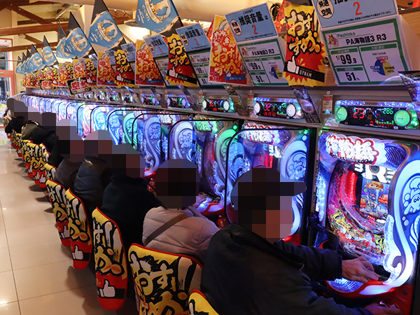 取材時は既に多くのプレイヤーが集結し、パチンコ・パチスロを問わずにぎやかな状況となっていた。