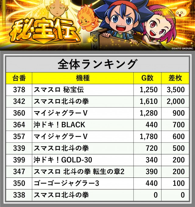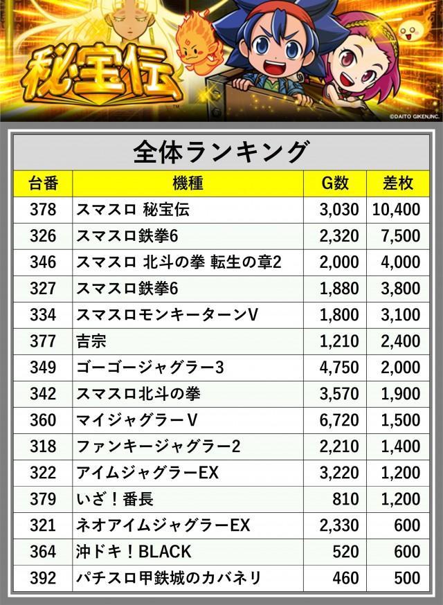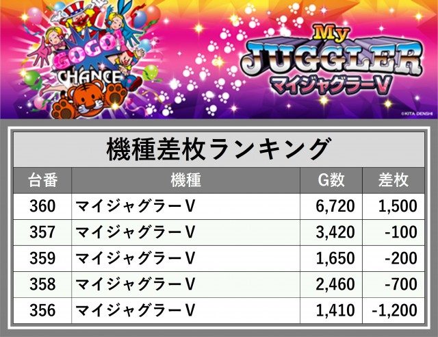 厳選された取材対象機種をはじめ、その他スロット全体から好記録が飛び出した!プレイヤーが楽しんだ1日を下記データにて振り返ってみて欲しい。