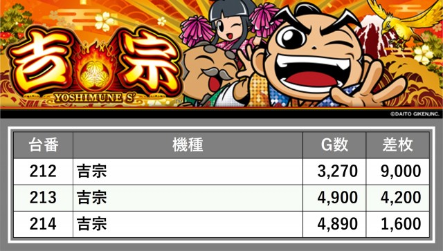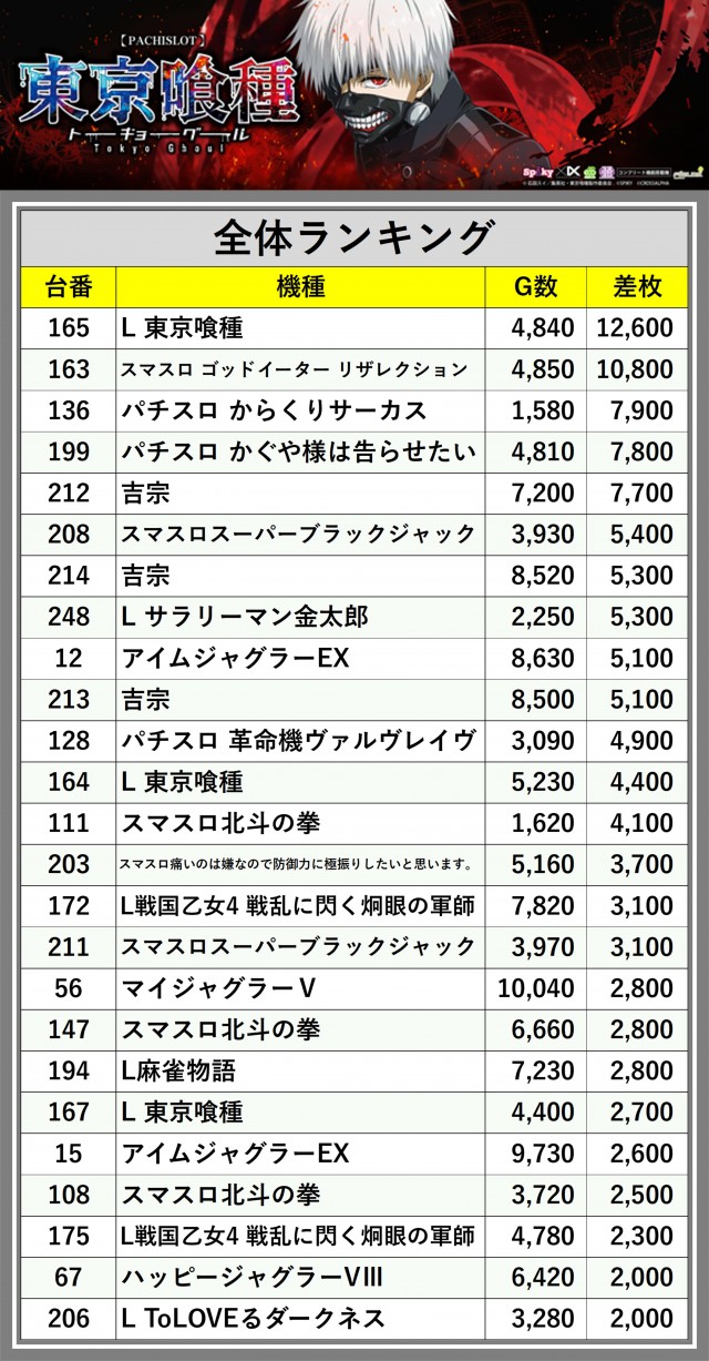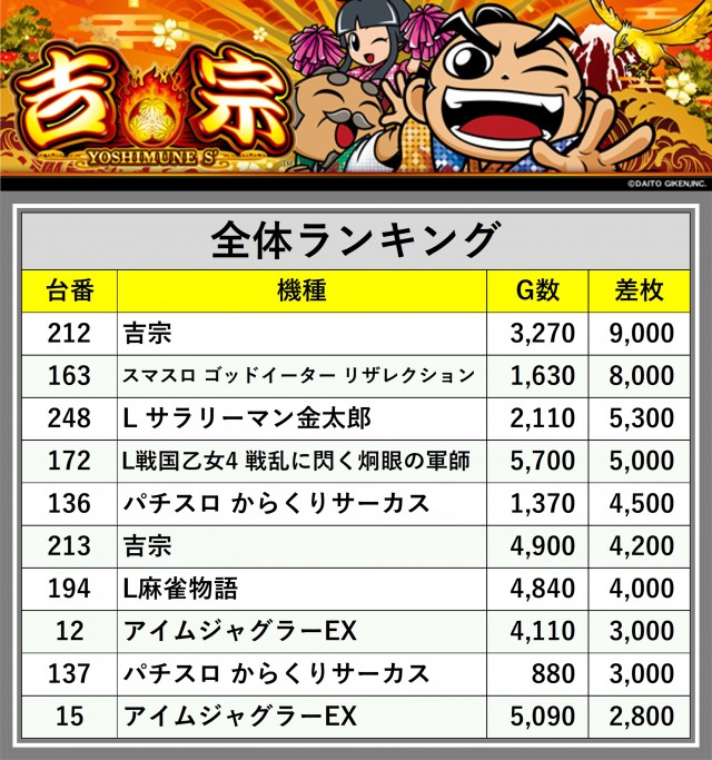 厳選された取材対象機種をはじめ、その他スロット全体から好記録が飛び出した!プレイヤーが楽しんだ1日を下記データにて振り返ってみて欲しい。