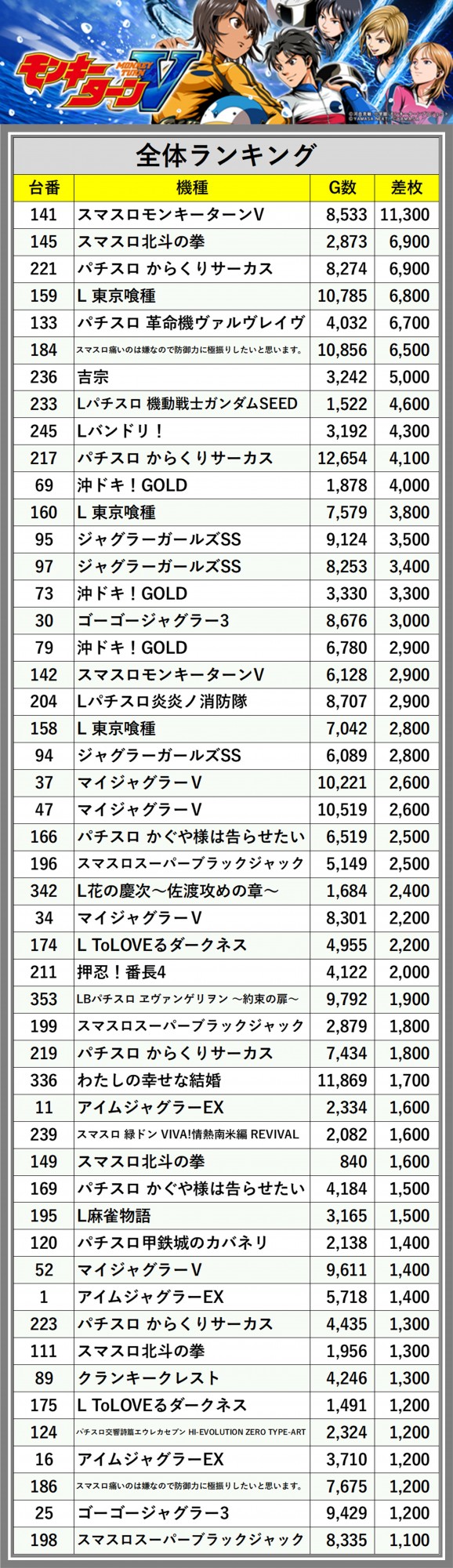 厳選された取材対象機種をはじめ、その他スロット全体から好記録が飛び出した!プレイヤーが楽しんだ1日を下記データにて振り返ってみて欲しい。