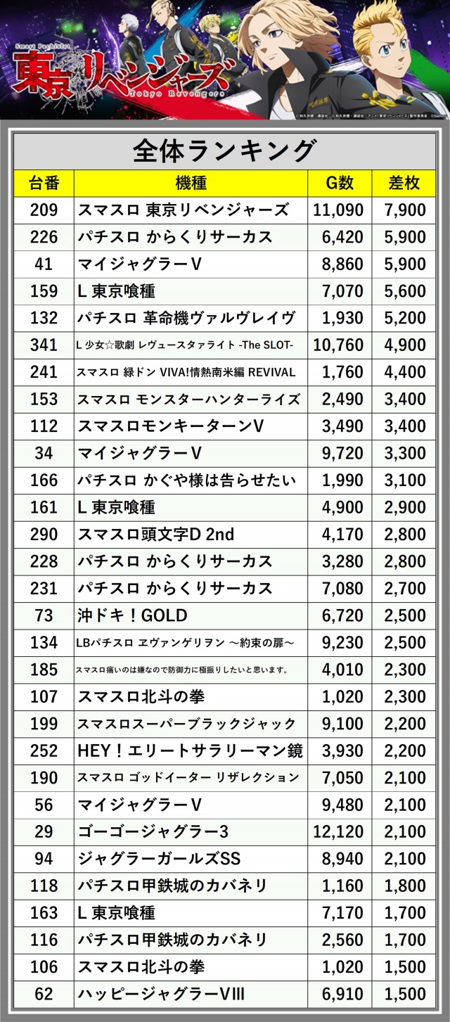※差枚数順に掲載しています