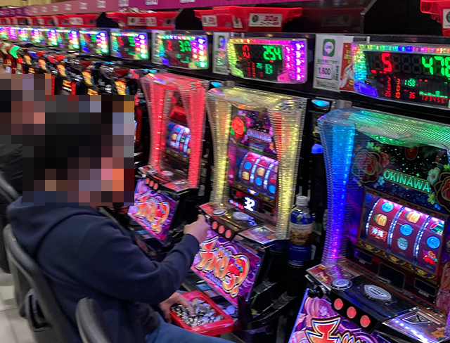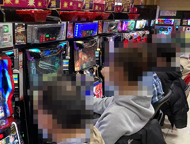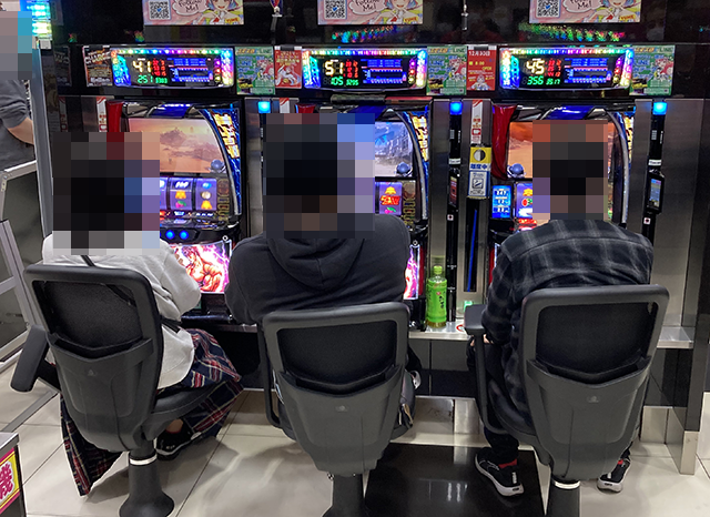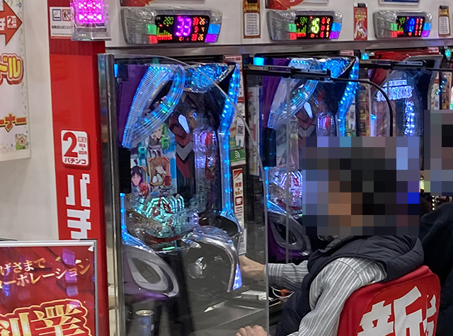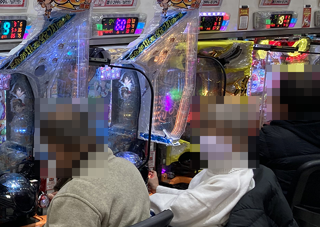 取材時は2名が座っており、1箱以上と2箱以上の持ち玉を確認している。