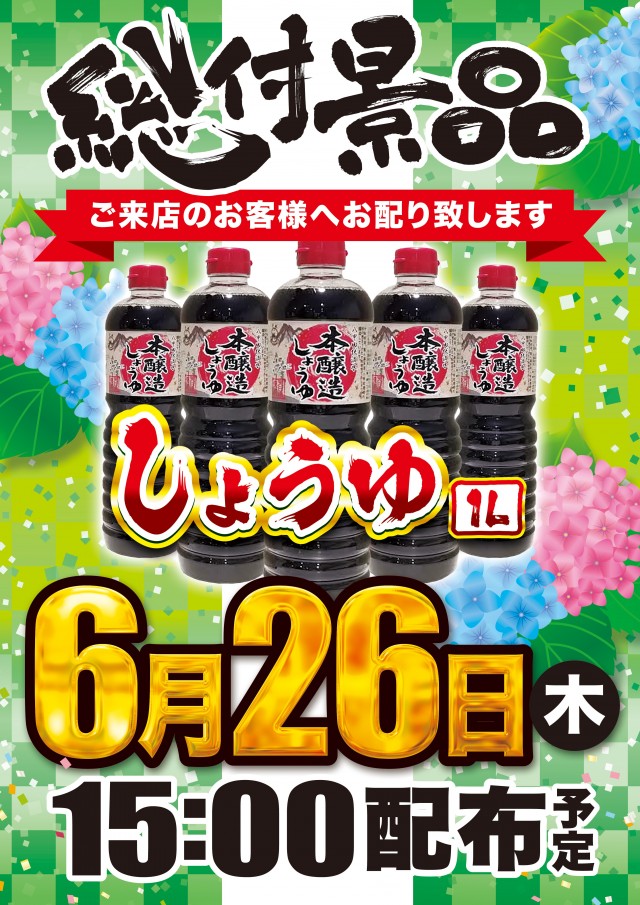 本日⑥/㉖(木)🌞抽選入場あさ9時開店🎵総付けしょうゆ配布🍙