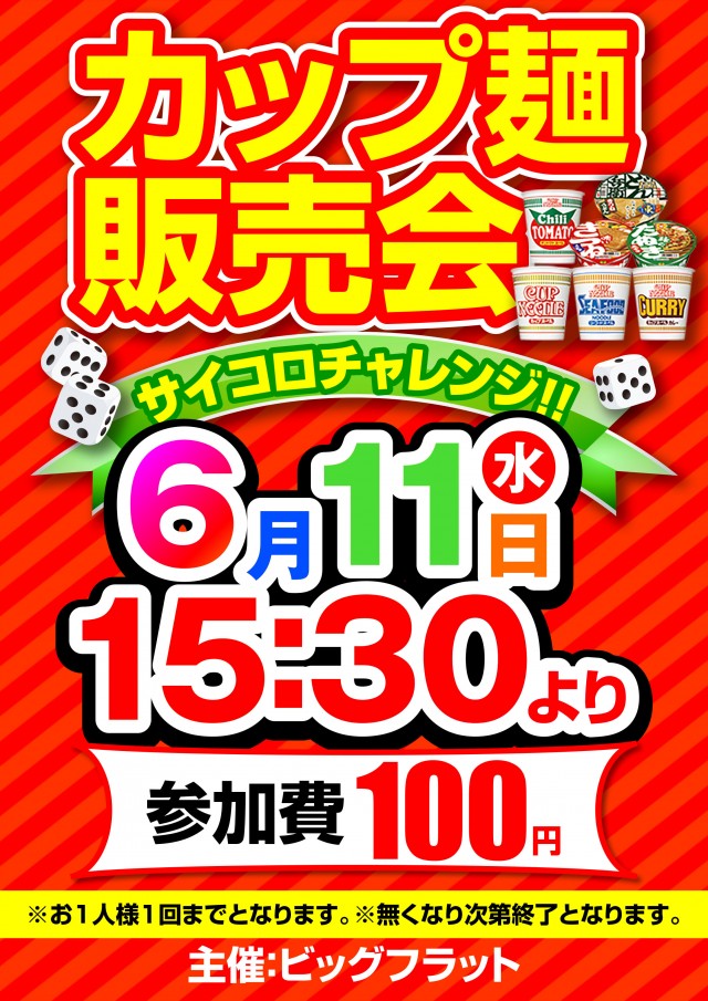 本日⑥/⑪(水)🌞抽選入場あさ9時開店🎵カップメン販売会🍜