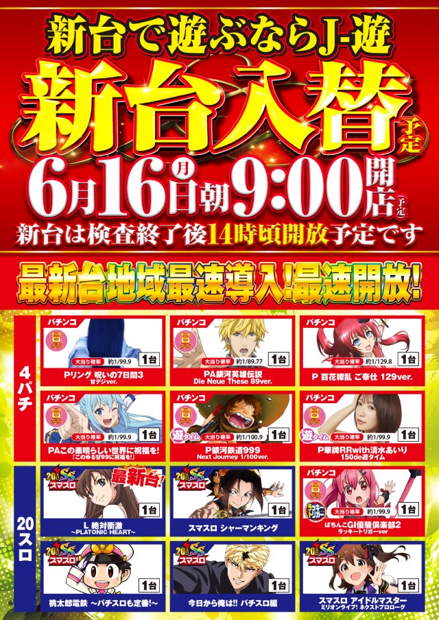 🌈⑥/⑯(月)新台入替9時オープン🌈(開放👉14時予定)