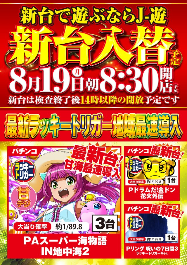 🌈本日⑧/⑲(月)新台入替8時30分オープンLT機大量導入🌈
