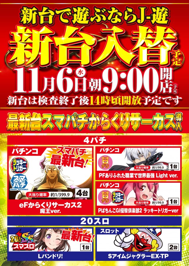 🌈本日⑪/⑥(水)新台入替9時オープン🌈(開放👉14時予定)