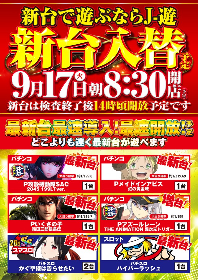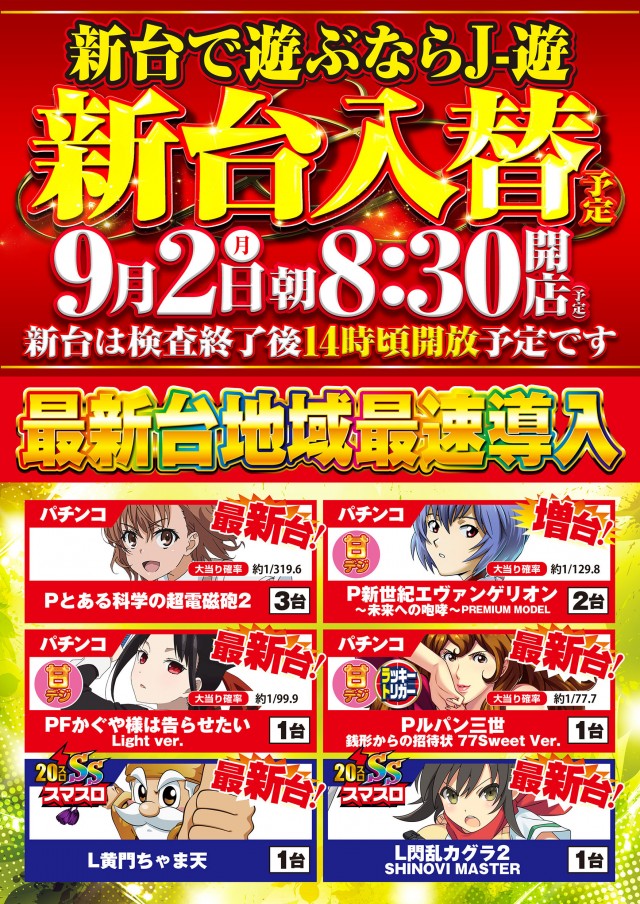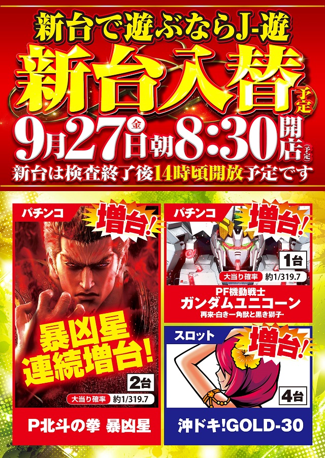 🌈本日⑨/②(月)新台入替8時30分オープン🌈