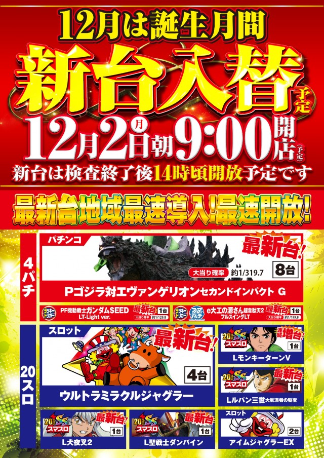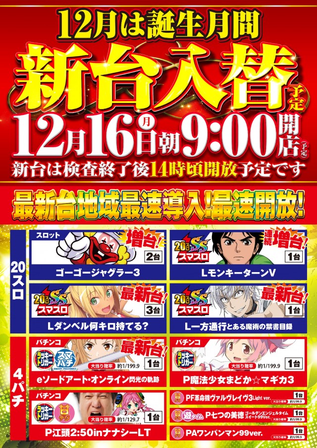 🌈本日⑫/⑯(月)新台入替9時オープン🌈(開放👉14時予定)