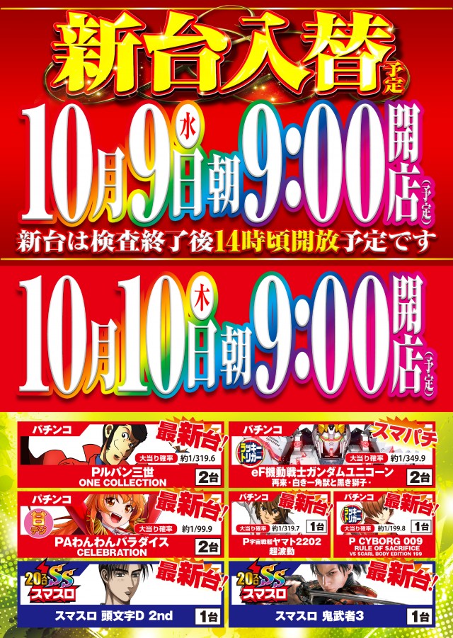🌈本日⑩/⑨(水)新台入替9時オープン🌈(開放👉14時予定)