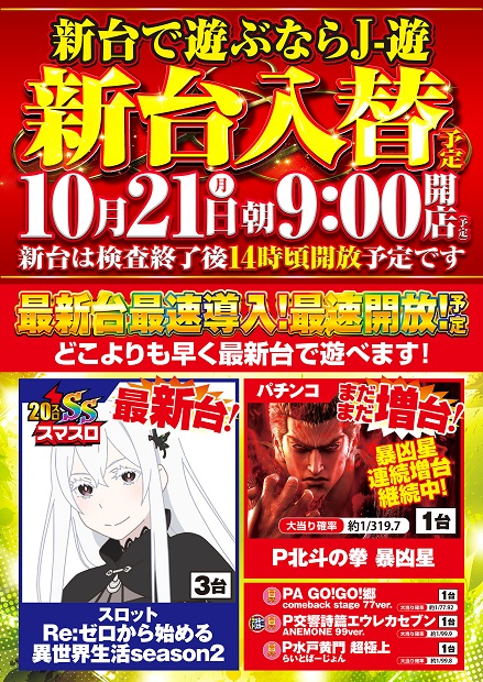 🌈本日⑩/㉑(月)新台入替9時オープン🌈(開放👉14時予定)