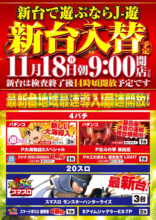🌈本日⑪/⑱(月)新台入替9時オープン🌈(開放👉14時予定)