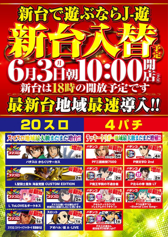 🌈本日⑥/③(月) 新台入替10時オープン!🌈