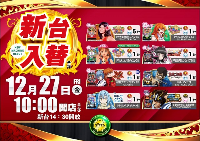 本日12月27日(金) 新台入替 10:00開店(予定)