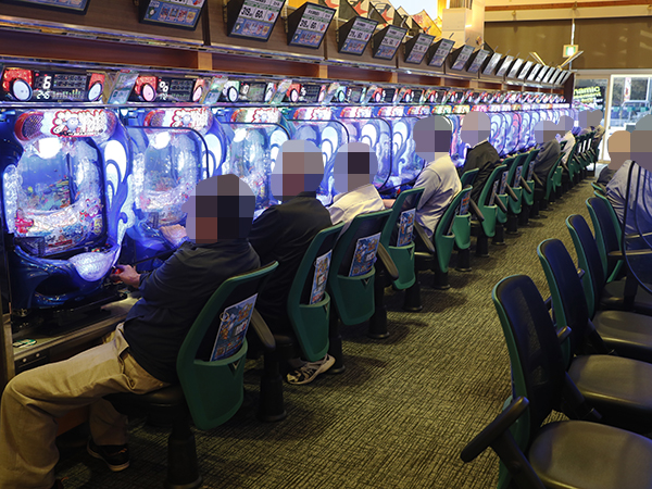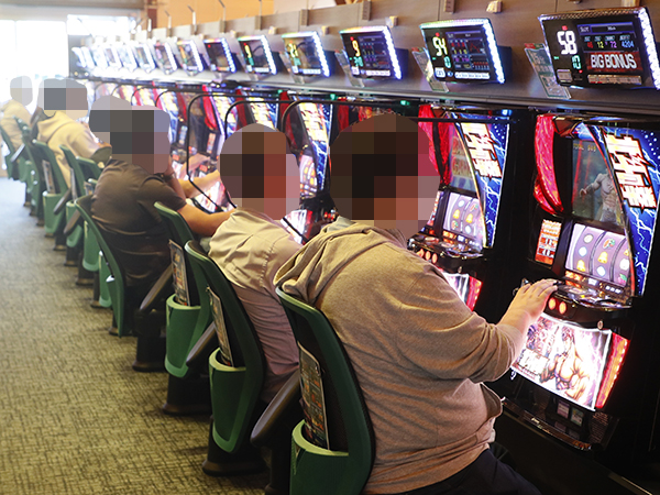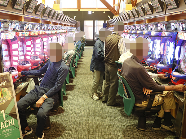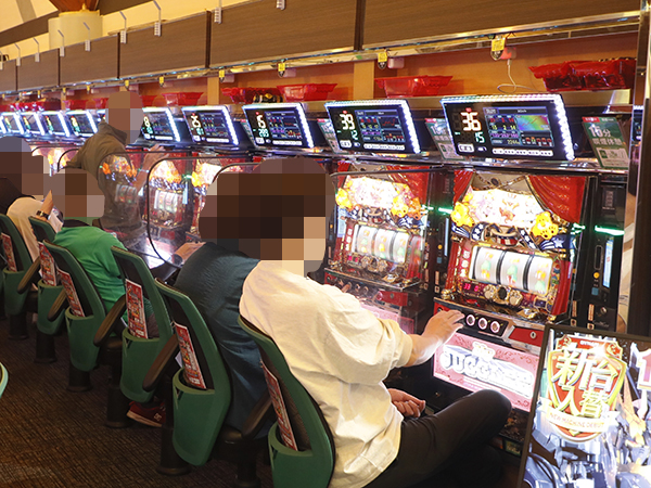 取材時は多くのプレイヤーが来店。パチンコ・パチスロともに、様々な機種が支持を集めていた。