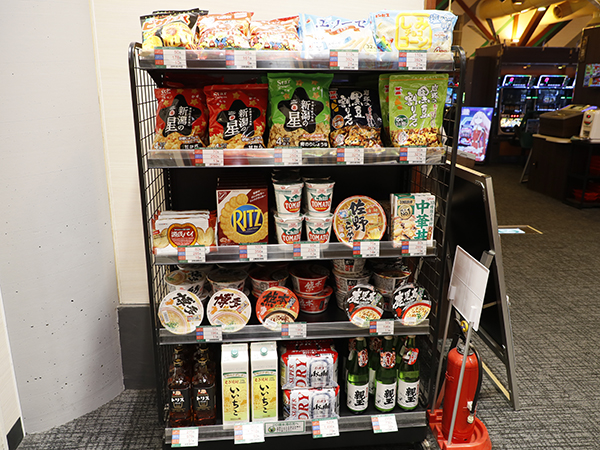 景品コーナーにはお菓子・インスタント食品・酒類など多彩なアイテムが揃っており、プレイヤーたちの目を引いていた。