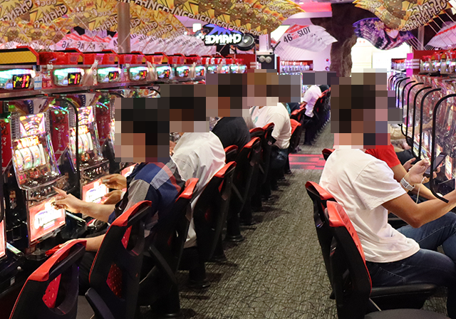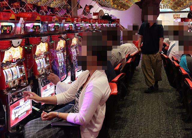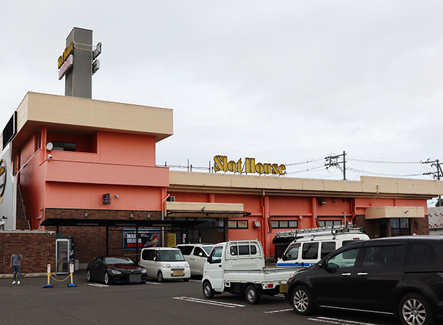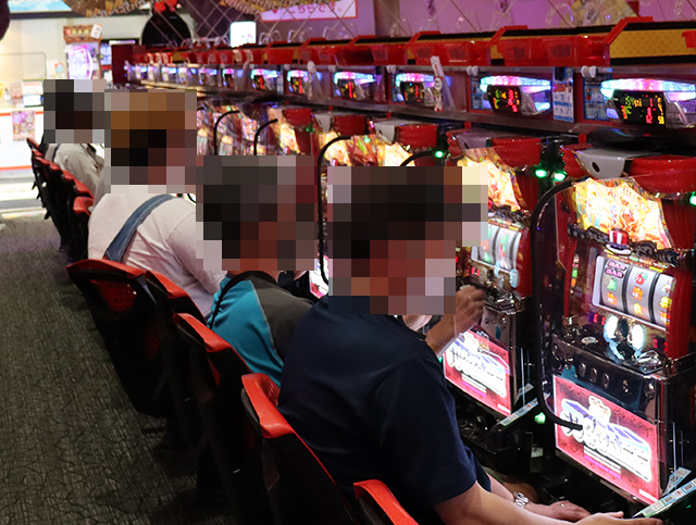 舞台の「スロットハウスムサシ矢本店」では、さまざまな機種に笑顔をみせるプレイヤーの姿があった。